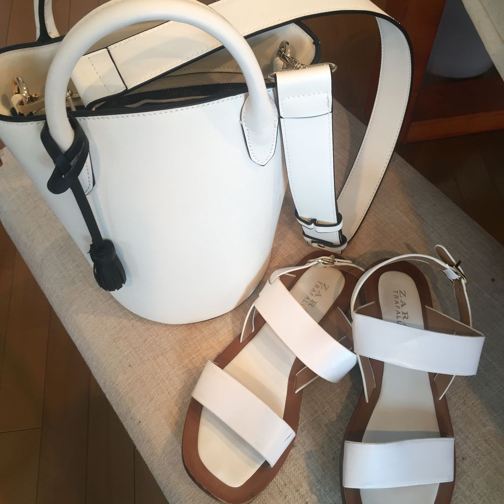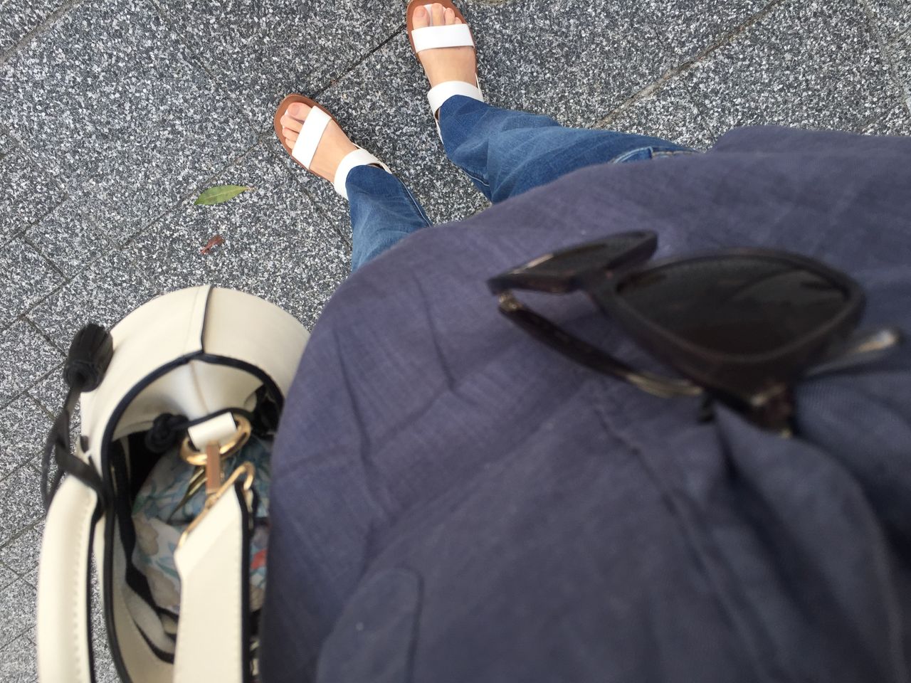 淡い色使い、薄くて軽やかな素材、素足にパンプス、